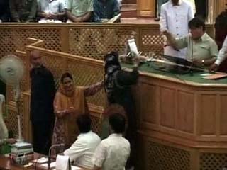 J&K Democratic Party chief Mehbooba Mufti throwing a microphone at the speaker, Mohammad Akbar Lone, in the Legislative Assembly on Monday.