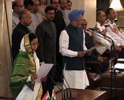 Pratibha Devi Singh Patil administering the oath of office to Manmohan Singh as