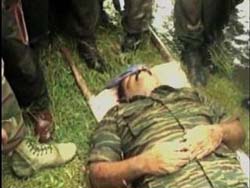 Lankan army soldiers seen surrounding a body that has Prabhakaran's trademark