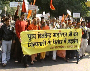 VHP and Bajrang Dal volunteers protesting against the arrest of junior Kanchi Sankaracharya Swami Vijayendra Saraswati in New Delhi on Wednesday