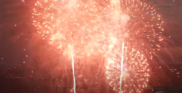 Explosions of fireworks over the National Mall and Brooklyn Bridge
