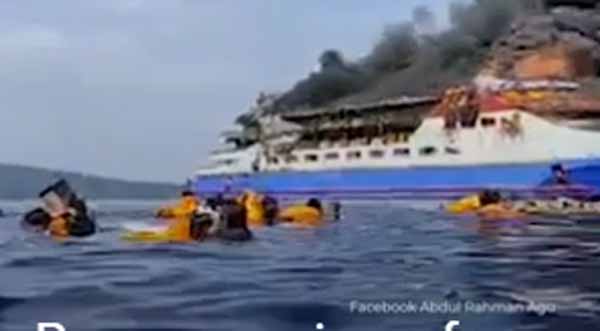 Passengers jumped off the burning ship into the sea wearing life jackets. Screams could be heard as several people floated in the sea waiting to be rescued. Most passengers were rescued but casualties may go up.