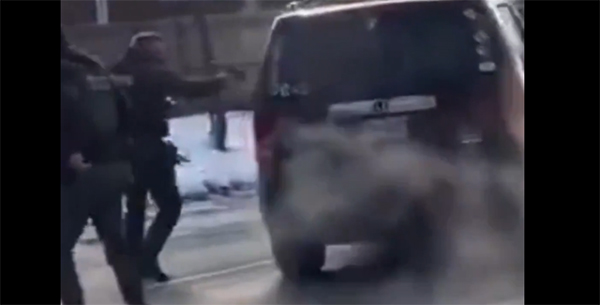 and one agent tugging at the driver’s door. Footage shows shots fired within