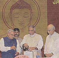 Vajpayee also released commemorative coins of the denominations of Rs 5 and Rs 100 on the occasion. Home Minister LK Advani, who was also present, explained the precepts of ratnatraya - three jewels - of Jainism: right faith, right knowledge and right action.
