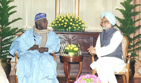 Nigerian President meets Manmohan Singh New Delhi: Nigerian President Olusegun Obasanjo on Wednesday met with Prime Minister Manmohan Singh in New Delhi. Obasanjo, the chairman of African Union, arrived from Tokyo on Tuesday. He is also slated to meet other top Indian dignitaries, including Foreign Minister Natwar Singh later in the day and address the Indian business community on Thursday. India and Nigeria have closely cooperated with each other in global forums like the UN, the Non-Aligned Movement, Group of 77 and the World Trade Organisation. Obasanjo is leading a high-level delegation, which includes Finance and Commerce Mininster Adamu Adris Waziri. Nigeria is India's largest trading partner in Africa and its largest supplier of crude oil.