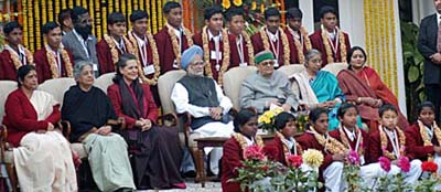 New Delhi: Seventeen children have been felicitated and awarded by the government for their exemplary acts of bravery. They were taken out for an elephant ride on Rajpath on Republic Day. They also received awards and gifts from President A P J Abdul Kalam. At a function organized at the Prime Minister's residence, these children were introduced to national leaders. "Such type of bravery that has been shown at the spur of moment, such type of the bravery that encourages others, I really congratulate these children. I am proud of them and I salute them," said the Prime Minister. Six children from India's seven north-eastern states were among those who won this year's bravery awards. Ratul Chandra Rabha and Rituparno Boro from Assam were given the top honour of Bharat Award for displaying exemplary courage in nabbing a fleeing militant. The whole country is proud of them. Seventeen-year old Master Putijungshi from Nagaland along with his friends saved the life of a person who was caught in a landslide. Without caring for his own safety he pulled out a middle-aged man from cascading rubble coming down with a mountain stream. Ten-year-old Seidalyne Mawtyllup from Meghalaya won the prestigious Geeta Chopra Award. This girl overawed by media attention saved her sister from fire. Her three-year-old sister was trapped inside a burning hut, and Seidalyne entered the burning house, covered her sister with a shawl and brought her out safely. Kumari Seidalyne Mawtyllup, Bravery award winner from Meghalaya said: "I feel proud for honour given by the Government of India...I want to be an army officer." "I am very happy. I am feeling nice to get the award...When I grow up I want to be an army officer," said the enthusiastic Putijungshi, Bravery award winner from Nagaland. Ten-year-old Kumari Leitanthem Pusparani Devi from Manipur is bravery personified, with childish face and steely determination. She saved a two-year-old. When she heard the cry of the drowning boy from a nearby pond she jumped in, swam towards the boy for about fifteen feet and brought out the semi conscious boy. While Nelson Karam, from Manipur, swam across a strong current about fifteen to twenty feet down stream and pulled out a drowning boy to safety. The two awardees from Assam were the cynosure of all eyes. Master Ratul Chandra Prabha and Master Rituparna Boro represented the modern face of Assam. They also represented the anguish of younger generation that has been affected by the culture of violence and uncertainty that the state has been thrown into by the separatist outfits like the ULFA. Rituparno Boro said: "This is the story of the tenth month of 2004. Militants called one of my teachers outside the school and shot him, when the militants started running away we chased them then the militants fired back at us students. Then Ratul moved ahead of me, Ratul went after the militants from one side and I moved from the other side, we saw that the militants are climbing on the mountain. Ratul went after the militants from one side and I from other side. Then Ratul threw a stone on one of the militants he fell down, and then we caught him and started beating him. We brought him down from the mountain and handed him over to the villagers and police." "Whatever militants are doing is bad. They beat up people, they ask for ransom. In the 2004 Dhemaji blast several small kids lost their lives. We the people of India want to get rid of the militants. This is the problem of not only Assam but the whole of the world. We want to live in peace." For these brave boys coming to the capital from the distant Kamrup district of Assam was a wonderful experience. They enjoyed the attention they got in Delhi. Master Ratul Chandra Rabha, another Bravery award winner from Assam said: "I felt happy meeting people. After getting a good education I want to serve the country through the army. I am an Indian and it's my duty to serve the country." The month-long stay in Delhi for these children from northeastern states has been a wonderful experience. They got to meet people from different parts of the country and realized what unity in diversity, a hallmark of the nation, really means.