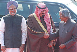 New Delhi: The King of Saudi Arabia, Abdullah bin Abdulaziz al-Saud was on Wednesday given a formal ceremonial welcome in the forecourt of Rashtrapati Bhavan. The King was received by President A P J Abdul Kalam and Prime Minister Manmohan Singh soon. He was escorted by Information and Broadcasting Minister Priyaranjan Dasmunshi, who was acting as the Minister of Protocol, to the ceremonial dais. Thereafter, he reviewed the inter-services guard of honour. After the ceremony, the Saudi King was introduced to members of the Indian Cabinet by Prime Minister Manmohan Singh. Dr. Singh was also introduced to the Saudi delegation accompanying the King. Talking to reporters on the sidelines of the ceremony, the King said that he was extremely happy to visit India and looked forward to attending the Republic Day celebrations of the country on Thursday, besides having fruitful discussions with the Indian leadership on ways to further enhance bilateral ties between the two countries. He then left with his entourage for Hyderabad House for a one-to- one discussion with Prime Minister Manmohan Singh, which was followed by delegation-level talks. King Abdullah arrived in New Delhi on Tuesday night on a landmark four-day visit, the first by a Saudi monarch in 51 years, signalling a major transformation in relations between oil rich Saudi Arabia and energy-seeking India. Prime Minister Manmohan Singh, defying protocol, received the Saudi monarch at the Palam Technical Area. Several senior government functionaries were present. The Saudi Monarch, who came from Beijing, arrived at 7.15 p.m., about two hours late. King Abdullah will be the chief guest at the Republic Day parade. His talks with Prime Minister Manmohan Singh are expected to focus on bilateral, regional and international issues which will be followed by the signing of several landmark agreements. India and Saudi Arabia will sign three agreements--a Memorandum of Understanding (MOU) on combating terrorism, a Double Taxation Avoidance Treaty and one for promoting bilateral investment. The Union Cabinet gave its approval for the signing of the treaties last week. The issue of hydrocarbon cooperation will also be a component of talks between Prime Minister Manmohan Singh and the Saudi King. Officials said India has a strong assurance from Saudi Arabia that any incremental requirement will be met by them. Saudi Arabia accounts for almost a quarter of India's total imports of oil of 1.9 million barrels per day. King Abdullah, who is accompanied by a large delegation, including his Ministers and prominent Saudi businessmen, will also address a business summit. A special session of the India- Saudi Arabia Business Council will be held during the visit. The King will inaugurate a Saudi exhibition and witness the signing of Trade Agreements. He will call on President A P J Abdul Kalam on Wednesday evening. On January 27, Vice President Bhairon Singh Shekhawat, UPA Chairperson Sonia Gandhi and Opposition Leader in Lok Sabha L K Advani will call on him. This will be followed by a visit to the Jamia Milia Islamia University where the King will be conferred with an honorary Doctorate by the University. He will leave in the evening the same day. Saudi Arabia and the other five Gulf Cooperation Council (GCC) member-states---United Arab Emirates, Oman, Qatar, Bahrain and Kuwait---have always been of great significance for India, located as they are in its immediate neighbourhood. The visit is also important as it is taking place about one and a half years after an agreement between India and the GCC countries to establish multi-dimensional economic partnership as a prelude to a free trade area between the two regions. The oil-rich region is one of India's most important sources of supply of crude oil and home to about 3.5 million Indians who send about six billion dollars back home every year in remittances. As a group, the GCC is India's second largest trading partner. It is the single largest origin of imports into India and the second largest destination for exports from India. Besides, India is home to the second largest population of Muslims after Indonesia while Saudi Arabia is the birthplace of Islam. India gears up for 57th Republic Day celebrations New Delhi: Indians are looking forward to celebrating the country's 57th Republic Day tomorrow. The parade will be commanded by General Officer Commanding, Delhi Area Major General P C Bhardwaj. Brigadier K M S Shergill will be the parade's second-in-command. The parade, which will showcase the country's military prowess, will see the Indian Army's Maratha Light Infantry Regiment, the Rajputana Rifles Regiment, the Sikh Light Infantry Regiment, the Garhwal Rifles Regiment, the Kumaon Regiment, the Jammu and Kashmir Rifles and the Territorial Army (SIKH) marching down Rajpath in front of a distinguished gathering that will include the President of India A P J Abdul Kalam, the Chief Guest and Saudi Arabia's King Abdullah Bin Abdulaziz Al-Saud, Prime Minister Dr. Manmohan Singh, the chiefs of the three defence services - Army, Navy and Air Force and others. The marching contingents of Navy and the Air Force will consist of 144 soldiers and four officers each. The para-military and other auxiliary civil forces contingents will include the Border Security Force, the Assam Rifles, the Coast Guard, the Central Reserve Police Force, the Indo-Tibetan Border Police, the Central Industrial Security Force, the Sashastra Seema Bal, the Railway Protection Force, the Delhi Police, National Cadet Corps and the National Service Scheme. The Camel mounted Band and Contingent of the BSF will also participate. The function will commence with Prime Minister Manmohan Singh leading the nation in paying homage to the country's martyrs by laying a wreath at the Amar Jawan Jyoti at India Gate. An eternal flame burns at the Amar Jawan Jyoti to commemorate the indomitable courage of our Armed Forces personnel who have made the supreme