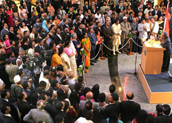 According to legend, soon after Lord Buddha attained samadhi more than 2,500 years ago, his relics were divided into eight equal parts and enshrined in the great stupas built that time. Later, Emperor Ashoka of the Mauryan Dynasty recovered one of the eight parts and distributed it in equal parts among 84,000 stupas. In Myanmar,the stupas came to be known as pagodas. The Shwedagon Pagoda is located atop a hill 58 meters high and its golden mast rises a further 99 meters. Little is known about what happened to the shrine between the period of its foundation and the 14th century. In the 14th century, it was enlarged by the King of Bago. Subsequent kings of the Mon Dynastry carried out further reconstructions and enlargments, besides renovations. The last major reconstruction effort was carried out in the 18th century. In 2003, Vice President Bhairon Singh Shekhawat donated coloured glassses worth Rs.three lakh to the pagoda. President Kalam's agenda for the day includes participation in a tree-planting ceremony at the People's Park here. He will then proceed to the Pyithu Hluttaw to make a courtesy call on Senior General Than Shwe, the Chairman of Myanmar's State Peace and Development Council. This will be followed by an agreement signing ceremony. He will then proceed to the No.1 Basic Education High School located in the Dagon Township, where he will interact with local Myanmarese students. After a private lunch at the Park Royal Hotel, Kalam will proceed to the Myanmar Info-Tech Park in the afternoon and will spend a couple of hours there. A visit to the mausoleum of India's last Mughal Emperor Bahadur Shah Zafar is scheduled to take place at 4. 20 p.m. (Myanmar time). He will then return to the hotel and then proceed for a state banquet and a cultural performance at the Pyithu Hluttaw The objective of the trip is to consolidate India's economic and political ties with these two countries. This is Kalam's first visit to both the countries as President and he will be accompanied by Foreign Secretary Shayam Saran and other senior functionaries of various ministries. In his three-day visit to Myanmar, the President will give a fresh impetus to political understanding between New Delhi and Yangon. India has been keen to tap Myanmar's gas reserves and this could be routed through a pipeline to the northeast or any other option, including converting it into liquefied natural gas (LNG) and shipping it to India. Kalam visits 'Apravasi Ghat' in Mauritius Port Louis: The visiting President A P J Abdul Kalam today visited the `Apravasi Ghat` where the first batch of Indian indentured labourers arrived in the 1830s. Formerly known as the Coolie Ghat, it was proclaimed a National Monument in 1987 as it forms part of the cultural heritage of Mauritius.