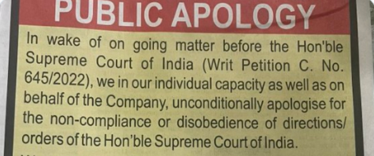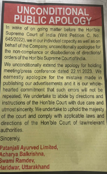 In the apology, Ramdev and Balkrishna said they "un-conditionally apologise" in their individual capacity as well as on behalf of Patanjali Ayurved for "the non-compliance or disobedience of directions/orders of the Supreme Court of India" relating to the "misleading" advt case.