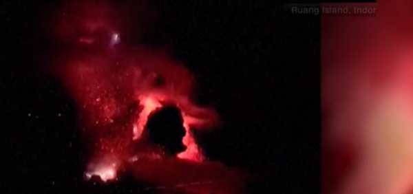 on Ruang island, erupted again early Tuesday morning spewing lava and ash, leading