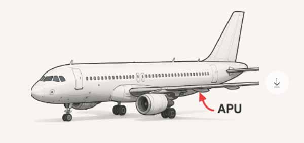 The APU is a small gas turbine engine that runs on jet fuel from the aircraft’s