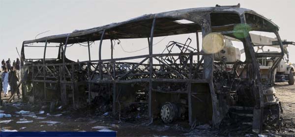 the bus, fully loaded with passengers. The bus also caught fire, and the majority