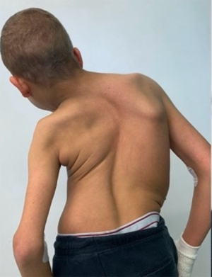 Symptoms are uneven shoulders or hips, one shoulder blade sticking out, uneven