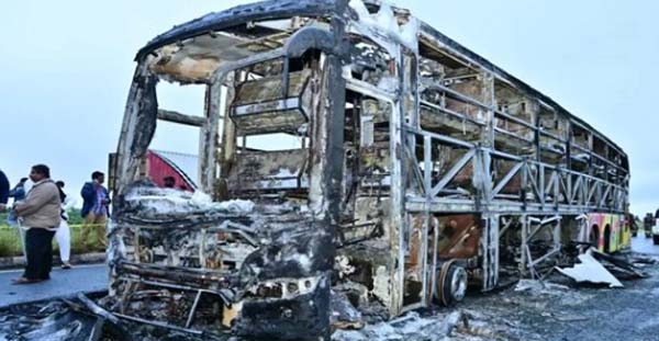 20 burnt to death as bus catches fire after collision with bike in Andhra