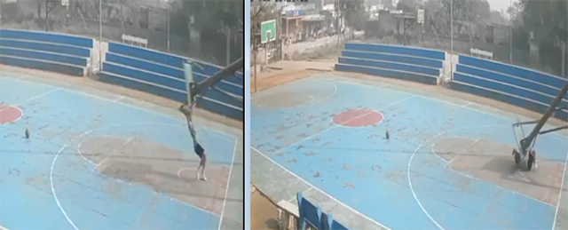 to hang from the hoop. A CCTV footage shows the metal pole buckling and falling