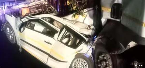 While the taxi coming from Manesar side rear-ended a broken-down dumper truck at Palwal on the Kundli-Manesar-Palwal (KMP) Expressway, another speeding truck coming from behind collided the taxi and crushed it.