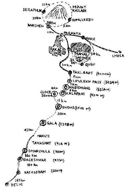 Kailash, Manasarovar Yatra - A Sketch -R M Nair Normally there are 16 batches of 35 pilgrims every year. According to a time-table, the yatris are called to Delhi batch-wise. Officials brief them and they are put up at a hotel. On return after pilgrimage also they stay here, before they leave for home. Their first day in Delhi is for medical examination (second one), second day for payments and detailed briefings on the yatra and on the third day they can collect their visas and forex and set off. The yatris reach Kathgodam (280 km) by bus. The second night they spend at Bageshwar (180 km). The following night halts after each day's trek are Dharchula (160 km), Gala (43 km), Budhi (20 km), Gunji (15 km), Kalapani (10 km), Navidhang (8 km), reaching Lipulekh (7 km) on the 9th day but the 9th night halt is at Taklakot across the border (19 km). Trekking begins at Mangti, which lies between Dharchula and Gala. The Kumaon Mandal Vikas Nigam makes all arrangements for accommodation, food etc at all the halts from New Delhi to Lipulekh Pass. Pucca barracks and pre-fabricated fibreglass huts are provided. Satisfactory toilet facilities, power supply for limited duration with generators, mattresses and quilts/sleeping bags are available. Ponies and porters, if needed, should be booked at Mangti for upward journey to Lipulekh Pass and at Lipulekh Pass while returning. Ponies and porters are not available in between. Officials advise everyone better hire a pony. The Uttar Pradesh Govt makes arrangements for medical aid at all the camps in India. Two medical personnel accompany the yatris up to Gunji. Beyond this point, the ITBP takes care of the medical arrangements up to Lipulekh Pass. All base camps in India are connected by a wireless network. A mobile wireless set also moves with the pilgrims up to Lipulekh Pass. This facility is not available for private messages. However, pilgrims can use the telephone facilities at Dharchula, Gala, Budhi, Gunji and Navidhang to contact their relatives. During the pilgrimage, a wireless link monitors the progress of the yatra on the Chinese side. The MEA has a liaison officer for each batch. A medical officer is also supposed to accompany each batch. On the Chinese side, no doctor accompanies the prigrims during the parikramas. The yatris are advised to carry personal medicines. On day 9, Chinese representatives meet the pilgrims at Lipulekh Pass. For Taklakot, for an hour one has to ride on pony and the rest by bus. Taklakot is a town and a shopping centre. There is a time difference. The sun rises 2 1/2 hours early on that side of the border, officially. Immigration formalities are completed here. Camps along the Kailash and Manasarovar routes can accommodate only 20 persons each at a time. Therefore, the batch is split into two, one goes to Kailash while the other to Manasarovar. Since the Manasarovar parikrama is a little easier, older and tired pilgrims join this group first. The liaison officer divides the group. The yatris take rest and do shopping. On day 11 groups A and B start for Darchan and Hore, respectively. The Kailash parikrama group is dropped at Darchen and the bus turns back and Group B is dropped at Hore. Group A reaches Deraphuk on day 12, on day 13 Zongerbu, on day 14 back to Darchen. Group B reaches Qugu on day 12, on day 13 Zaidi and day 14 rest there. On day 15 group A goes to Hore, day 16 Qugu, day 17 Zaidi and day 18 rests there. On day 15 Group B reaches Darchen, day 16 Deraphuk, day 17 Zongerbu, day 18 back to Darchen. On day 19 the bus comes to Darchen, picks up Group B and returns to Zaidi, takes Group A also, and comes back to Taklakot. Day 20 they pay a visit to Khojarnath. Immigration formalities are completed and they leave Taklakot on day 21 to reach Lipulekh Pass. Day 21 itself they reach Kalapani for night halt and on day 22 the night halt is at Gunji, on day 23 at Budhi, 24 at Gala, 25 at Dharchula, 26 at Bageshwar, and day 27 yatris are back in Delhi.